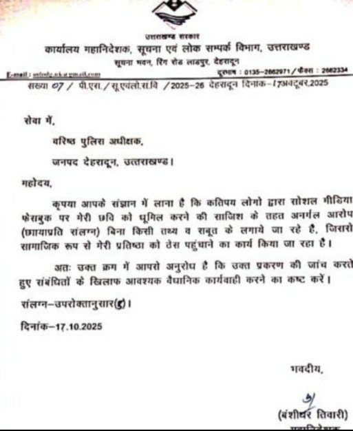 लेकिन कुछ लोग बिना सबूत के उनके खिलाफ सोशल मीडिया पर गलत जानकारी फैला रहे हैं। इसी सिलसिले में महानिदेशक बंशीधर तिवारी ने देहरादून पुलिस में शिकायत दर्ज कराई है। शिकायत में कहा गया है कि कुछ लोग गैंग बनाकर उनके खिलाफ अपमानजनक पोस्ट और अफवाहें फैला रहे हैं।