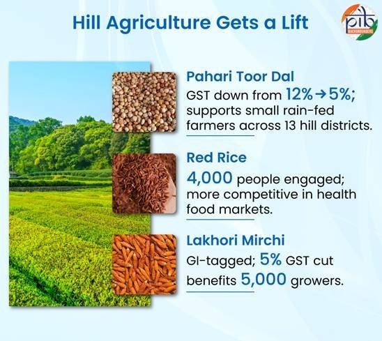 - पहाड़ी तूर दाल, लाल चावल और लखौरी मिर्च पर जीएसटी घटाकर 5% करने से पहाड़ी उत्पादों को बढ़ावा मिला है, जिससे 13 पहाड़ी जिलों के छोटे किसानों को मदद मिली है।